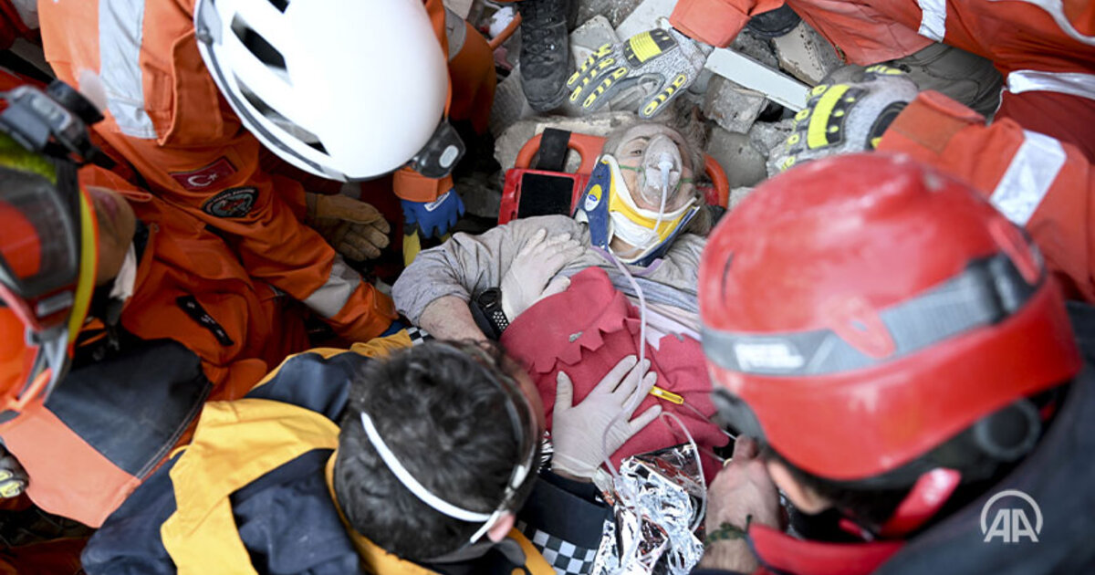 Old woman Umit Gulcicek is miraculously rescued alive from the rubbles of a collapsed building in Antakya district 130 hours after earthquakes