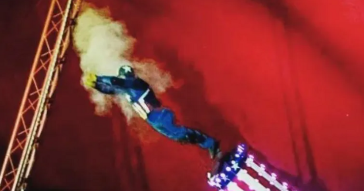 Εικόνες που τραβήχτηκαν από κινητά τηλέφωνα δείχνουν τον καλλιτέχνη, ντυμένο ως Captain America, να εκτοξεύεται από το κανόνι, να προσκρούει σε μεταλλικό φράγμα και μετά να πέφτει στο πάτωμα.