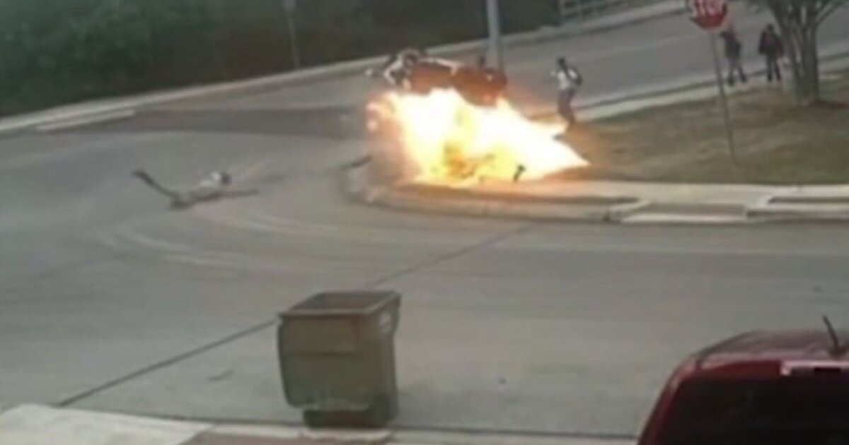 Συγκεκριμένα, σε βίντεο που προέβαλε το CBS News και έχει τραβηχτεί από κάμερα ασφαλείας στο Τέξας των ΗΠΑ, φαίνεται η στιγμή που η μηχανή σέρνεται με τεράστια ορμή στο οδόστρωμα, σκάει στο κράσπεδο του πεζοδρομίου και εκρήγνυται την ώρα που λίγα μέτρα πιο πέρα βρίσκονται δύο μικρά παιδιά, που περιμένουν να περάσουν τον δρόμο.