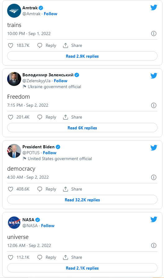 Για παράδειγμα η NASA έγραψε "universe" δηλαδή σύμπαν, ενώ ο πρόεδρος ΗΠΑ Τζο Μπάιντεν δημοσίευσε την λέξη "democracy", δηλαδή Δημοκρατία. Πως, όμως, έγινε η αρχή της νέας τάσης στην γνωστή πλατφόρμα;