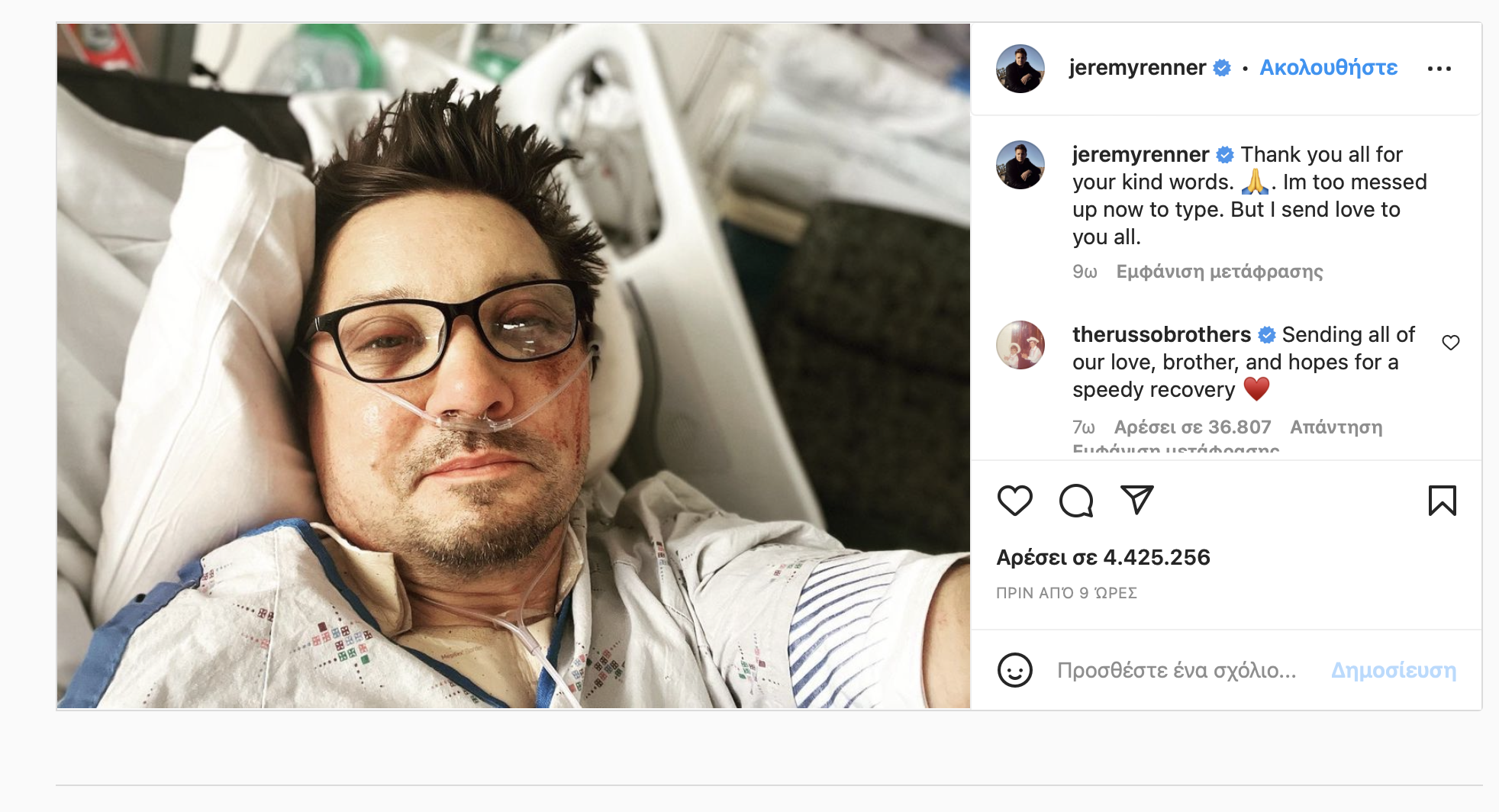 Το πρώτο του μήνυμα, από το κρεβάτι του νοσοκομείου, όπου νοσηλεύεται, έστειλε στους διαδικτυακούς του φίλους ο Αμερικανός ηθοποιός, Τζέρεμι Ρένερ.