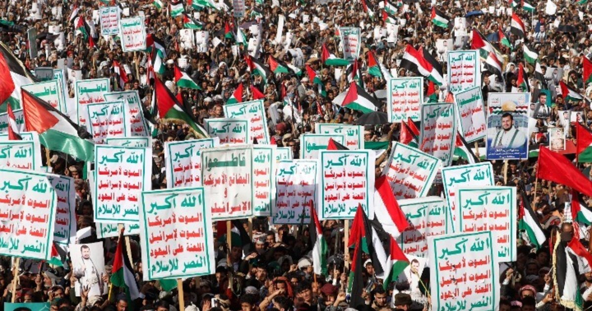 Το πλήθος κατέκλυσε την πλατεία Σαμπίν, στην καρδιά της Σαναά, κρατώντας σημαίες της Υεμένης και της Παλαιστίνης και φωτογραφίες του αρχηγού των ανταρτών Αμπντελμαλέκ αλ Χούθι και του αρχηγού της Χεζμπολάχ του Λιβάνου Χασάν Νασράλα, οι οργανώσεις των οποίων στηρίζονται από το Ιράν.