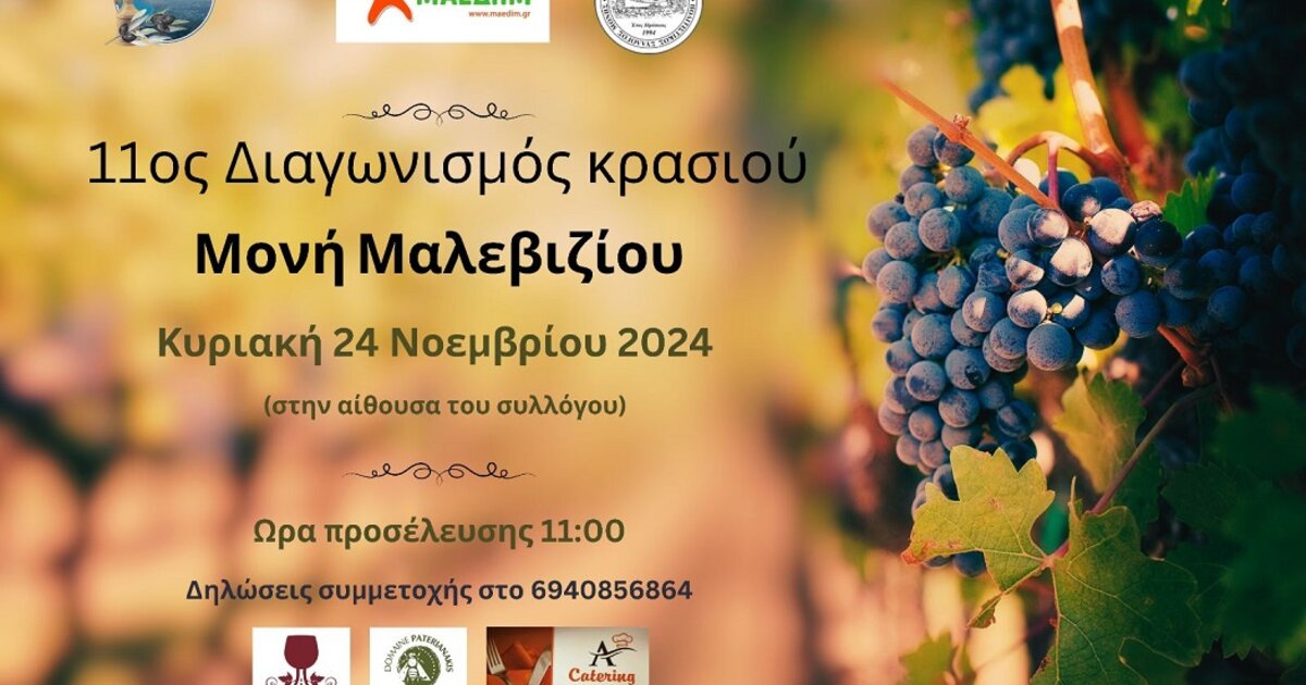 Ο Πολιτιστικός Σύλλογος Μονής σε συνεργασία με το Δήμο Μαλεβιζίου διοργανώνουν, για ενδέκατη χρονιά, στο Διαγωνισμό Κρασιού, την Κυριακή 24 Νοεμβρίου 2024 στις 11.00 το βράδυ, στην αίθουσα του συλλόγου στη Μονή Μαλεβιζίου.