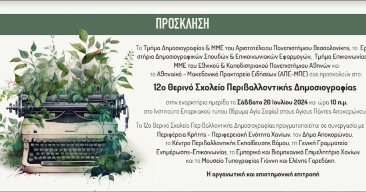 Το 12ο Θερινό Σχολείο Περιβαλλοντικής Δημοσιογραφίας θα πραγματοποιηθεί στα Χανιά, στις εγκαταστάσεις του Ινστιτούτου Επαρχιακού Τύπου (Ίδρυμα Αγία Σοφία) στους Αγίους Πάντες Αποκορώνου, από τις 19 έως τις 28 Ιουλίου 2024.