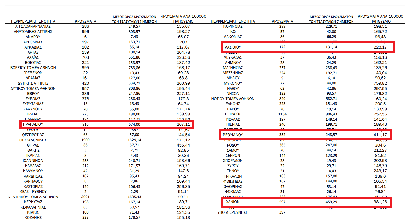 Σύμφωνα με τα στοιχεία της ημερήσιας έκθεσης επιδημιολογικής επιτήρησης τα κρούσματα στην Κρήτη κατανέμονται ως εξής: