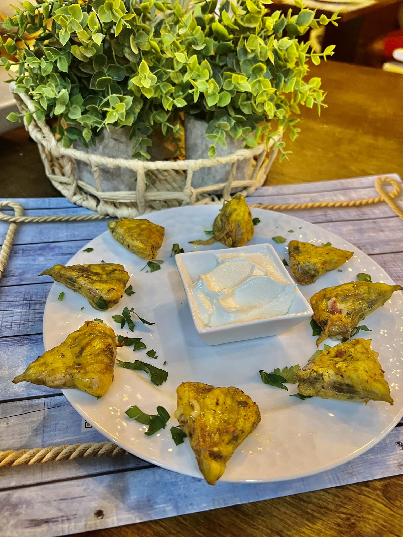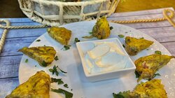 - Κρητικός ντάκος με φρέσκια ντομάτα, ξινομυζήθρα και έξτρα παρθένο ελαιόλαδο. - *Ανθοί γεμιστοί* με ρύζι, πλιγούρι και ανθότυρο.