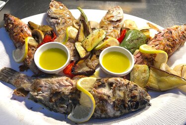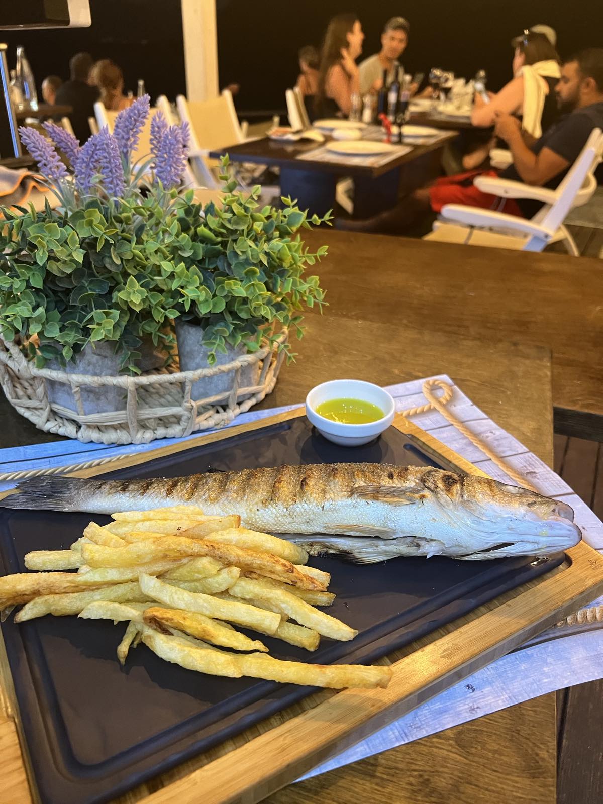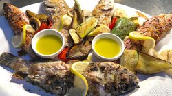 - Τσιπούρα φρέσκια στη σχάρα και λαβράκι σχάρας, αρωματισμένα με βότανα της Κρήτης.