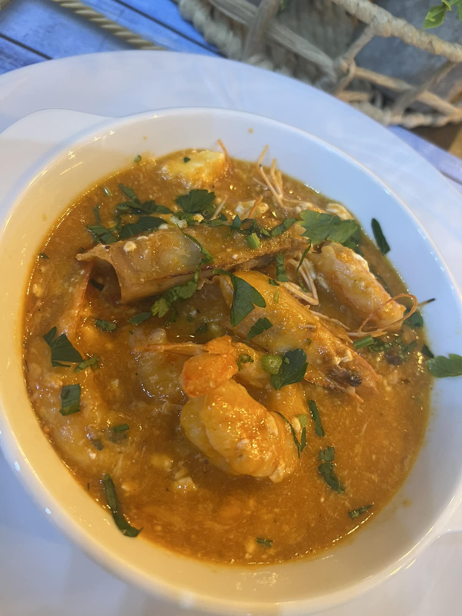 - Γαρίδες σχάρας με φρέσκο λαδολέμονο, συνοδευόμενες από τραγανές, φρέσκες τηγανητές πατάτες.