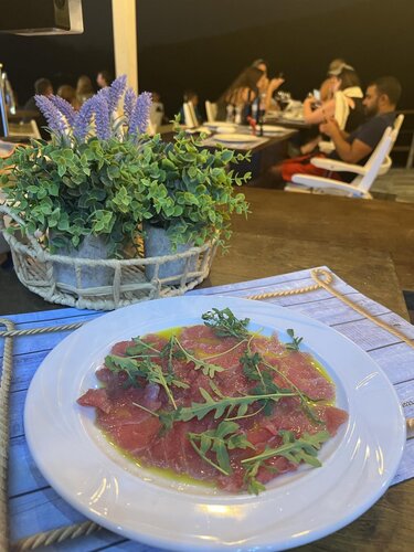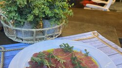- Φρέσκος τόνος καρπάτσιο, μαριναρισμένος με ελαιόλαδο και λεμόνι.