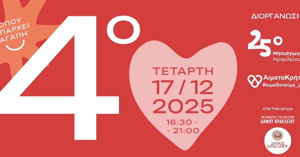 Το 25ο Νηπιαγωγείο Ηρακλείου σε συνεργασία με το σύλλογο "αιματοκρήτης" διοργανώνει το 4ο Festival Εθελοντισμού & Αιμοδοσίας την Τετάρτη 17 Δεκεμβρίου 2025, από τις 16:30 έως τις 21:00, στον χώρο του σχολείου (οδός Ρολέν 2).