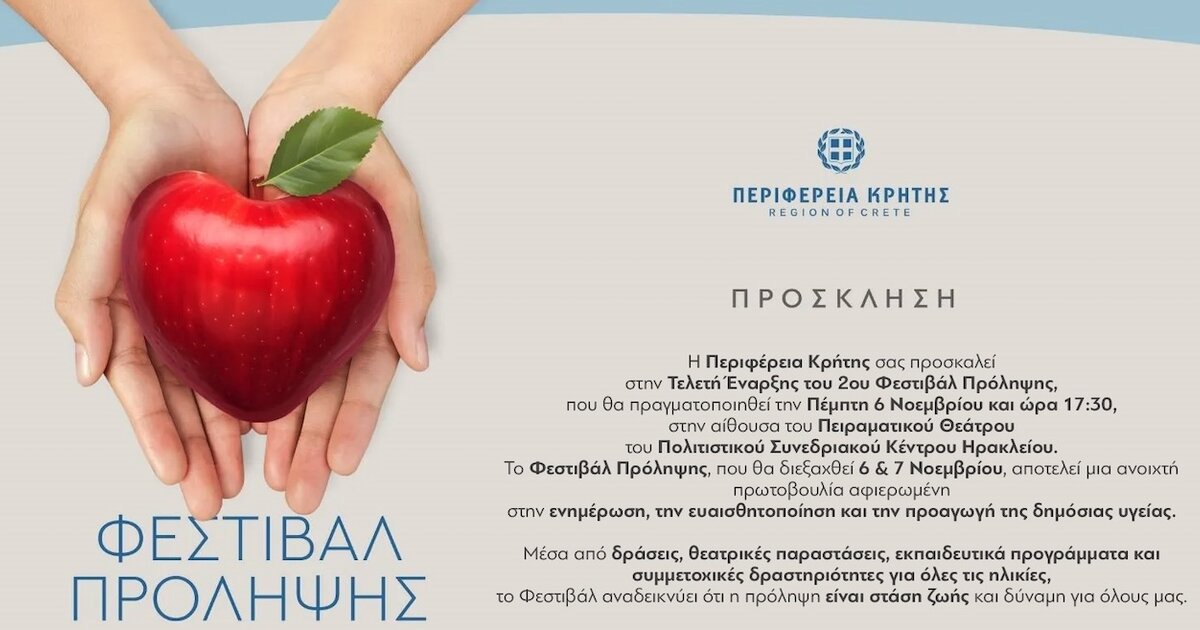 Η Περιφέρεια Κρήτης διοργανώνει για δεύτερη συνεχή χρονιά το Φεστιβάλ Πρόληψης, μια ανοιχτή δράση για όλους τους πολίτες, με ιδιαίτερη έμφαση στα παιδιά. Το φεστιβάλ πρόληψης θα πραγματοποιηθεί στις 6 και 7 Νοεμβρίου στο Πολιτιστικό και Συνεδριακό Κέντρο Ηρακλείου.