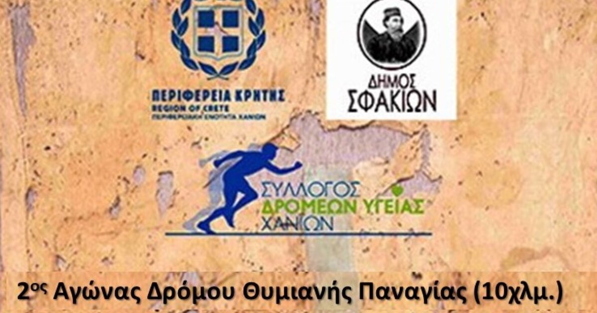 Η Περιφέρεια Κρήτης, ο Δήμος Σφακίων και ο Σύλλογος Δρομέων Υγείας Χανίων συνδιοργανώνουν τον 2ο αγώνα δρόμου «Θυμιανής Παναγιάς» (10 χλμ.). Ο αγώνας θα πραγματοποιηθεί την Κυριακή 2 Ιουλίου 2023 και ώρα 9:00 π.μ. στην Ίμβρο Σφακίων.