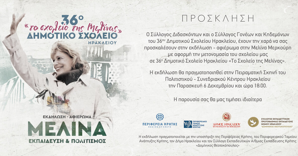 Ο Σύλλογος Διδασκόντων και ο Σύλλογος Εκπαιδευτικών Α/θμιας Εκπ/σης Ηρακλείου σας προσκαλούμε την Παρασκευή 6 Δεκεμβρίου 2024 στις 6:00 μ.μ. στην Πειραματική Σκηνή του Πολιτιστικού Συνεδριακού Κέντρου στο Ηράκλειο Κρήτης με αφορμή τη μετονομασία του Σχολείου μας σε :36ο Δημοτικό Σχολείο Ηρακλείου «το Σχολείο της Μελίνας»