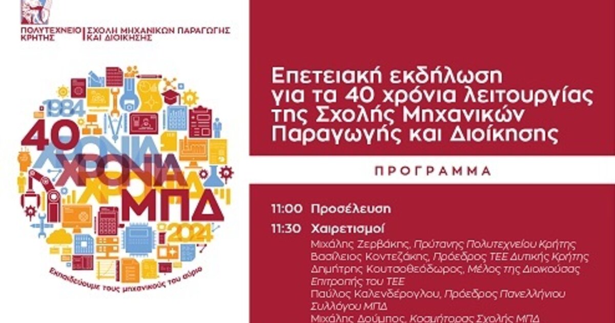 "Σας καλούμε να γιορτάσουμε μαζί αυτή την ιστορική στιγμή για τη Σχολή ΜΠΔ του Πολυτεχνείου Κρήτης και την έως σήμερα πορεία της, να αναδείξουμε το ρόλο του Μηχανικού Παραγωγής και Διοίκησης στο σύγχρονο περιβάλλον, τα επιτεύγματα της Σχολής, καθώς και τα μελλοντικά βήματα για την περαιτέρω ανάπτυξή της.