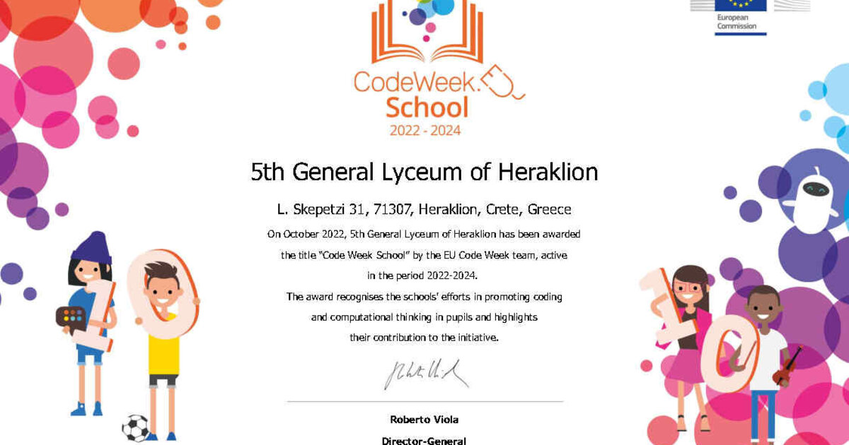 Το 5o ΓΕΛ Ηρακλείου είναι το ένα από τα δύο ελληνικά Γενικά Λύκεια και μοναδικό στην περιφέρεια Κρήτης, στα οποία απονεμήθηκε από την Ευρωπαϊκή Επιτροπή η ετικέτα αριστείας Code Week School για τα προσεχή δυο χρόνια 2022-2024.