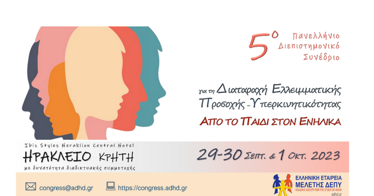 Η Ελληνική Εταιρεία Μελέτης της Διαταραχής Ελλειμματικής Προσοχής - Υπερκινητικότητας (ΕΕΜ ΔΕΠΥ) διοργανώνει το 5ο Πανελλήνιο Διεπιστημονικό Συνέδριο για τη ΔΕΠΥ «Από το Παιδί στον Ενήλικα» στο Ηράκλειο Κρήτης (Ibis Styles Heraklion Central Hotel) στις 29-30 Σεπτεμβρίου και 1 Οκτωβρίου 2023.
