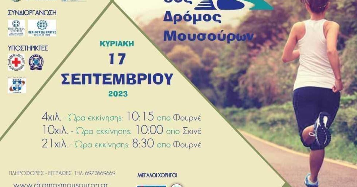 Ο Δήμος Πλατανιά, σε συνεργασία με το Σύλλογο Δρομέων Υγείας Χανίων και συνδιοργανωτή την Περιφέρεια Κρήτης, καθώς και την υποστήριξη της ΕΛΑΣ, του Ερυθρού Σταυρού και του ΣΥ.ΦΑ.Χ., ενημερώνουν ότι θα πραγματοποιηθεί για 5η χρονιά ο Αγώνας Δρόμου, με την επωνυμία “ 5ος Δρόμος Μουσούρων”, που θα διεξαχθεί την Κυριακή 17 Σεπτεμβρίου.