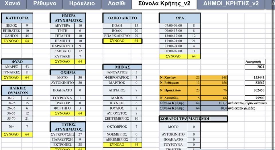 Σύμφωνα με τα στατιστικά στοιχεία του Γιάννη Λιονάκη, από τους 64 θανάτους από τροχαία δυστυχήματα, από 23 σημειώθηκαν στην Π.Ε. Χανίων και στην Π.Ε. Ηρακλείου, 13 στην Π.Ε. Ρεθύμνου και 5 στην Π.Ε. Λασιθίου.