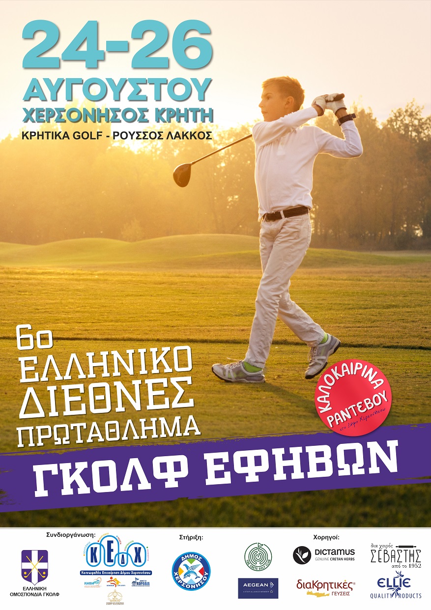 Το «6o Ελληνικό Διεθνές Πρωτάθλημα Γκολφ Εφήβων» συνδιοργανώνει η Κοινωφελής Επιχείρηση Δήμου Χερσονήσου (Κ.Ε.Δ.Χ.) στο πλαίσιο των εκδηλώσεων «Καλοκαιρινά Ραντεβού στο Δήμο Χερσονήσου 2022» μαζί με την Ελληνική Ομοσπονδία Γκολφ και με τη στήριξη του Δήμου Χερσονήσου.