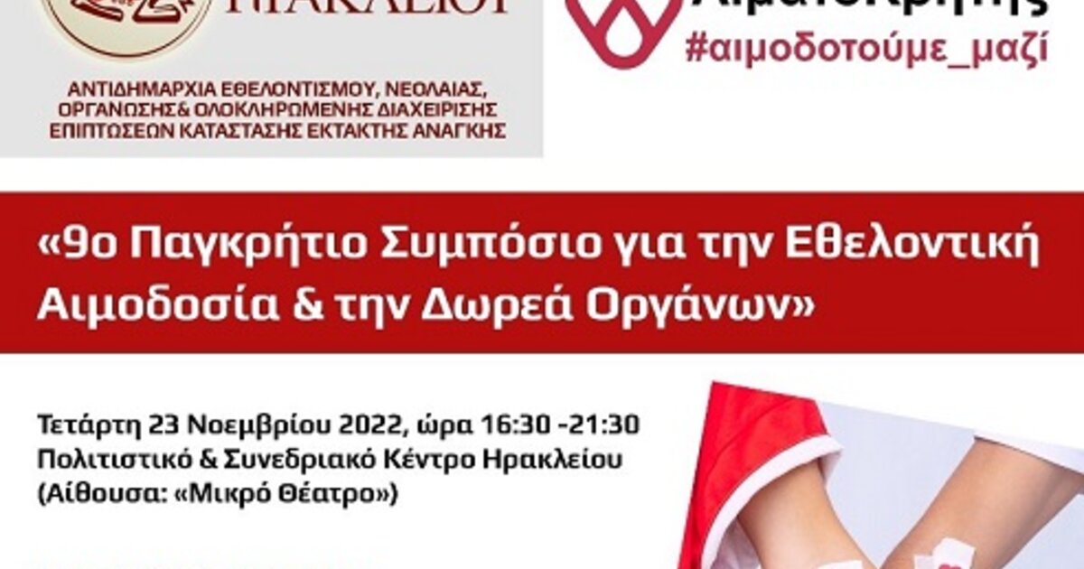 Στο πλαίσιο αυτών των πρωτοβουλιών η Αντιδημαρχία Εθελοντισμού, Νεολαίας, Οργάνωσης και Ολοκληρωμένης Διαχείρισης Επιπτώσεων Κατάστασης Έκτακτης Ανάγκης και ο Παγκρήτιος Σύνδεσμος Εθελοντών Αιμοδοτών και Δωρητών Οργάνων Σώματος «Αιματοκρήτης», διοργανώνουν την Τετάρτη 23 Νοεμβρίου στο Πολιτιστικό και Συνεδριακό Κέντρο Ηρακλείου (Αίθουσα: «Μικρό Θέατρο») το «9ο Παγκρήτιο Συμπόσιο για την Εθελοντική Αιμοδοσία και την Δωρεά Οργάνων».
