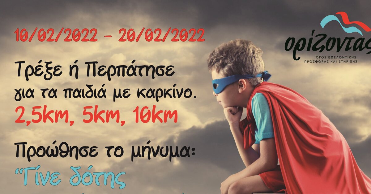 Ο Σύλλογος “Ορίζοντας” με αφορμή την Παγκόσμια Ημέρα κατά του Παιδικού Καρκίνου διοργανώνει συμβολικό Αγώνα Δρόμου- Δυναμικού Περπατήματος αποστάσεων 2,5χλμ, 5χλμ και 10χλμ, για μικρούς και μεγάλους!
