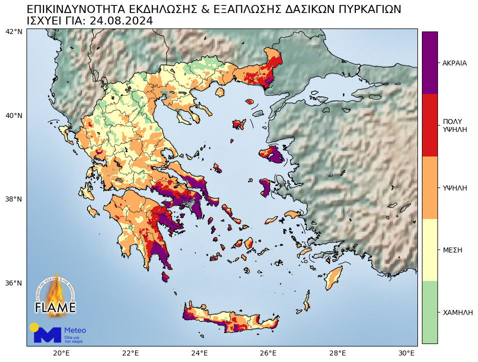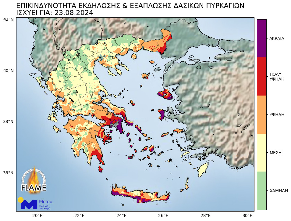 Ακραία επικινδυνότητα εκδήλωσης και εξάπλωσης δασικών πυρκαγιών στην κεντρική Ελλάδα και τα νησιά του Βορείου και Νοτίου Αιγαίου αλλά και πολλές περιοχές της νότιας Κρήτης, παρατηρούμε για την Παρασκευή και το Σάββατο (23 και 24 Αυγούστου) σύμφωνα με την πρόγνωση πυρομετεωρολογικής επικινδυνότητας (FLAME) του Εθνικού Αστεροσκοπείου Αθηνών/Meteo.gr με βάση το Καναδικό Σύστημα Πυρομετεωρολογικών Δεικτών (Canadian Forest Fire Weather Index System – CFFWIS), προσαρμοσμένο στο πυρικό περιβάλλον της Ελλάδας.
