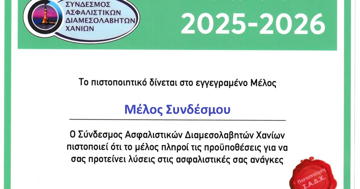 Ο Σύνδεσμος Ασφαλιστικών Διαμεσολαβητών Χανίων ενημερώνει ότι ανανεώθηκαν τα αυτοκόλλητα σήματα μελών για τα έτη 2025-