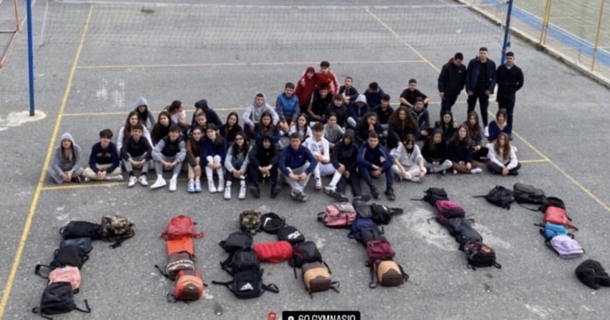 Οι μαθητές του 6ου Γυμνασίου διαμαρτυρήθηκαν για τα θύματα του σιδηροδρομικού δυστυχήματος αναρτώντας πανό στα κάγκελα της αυλής και σχηματίζοντας με τις σχολικές τους τσάντες στο προαύλιο το τεράστιο αναπάντητο "γιατί".