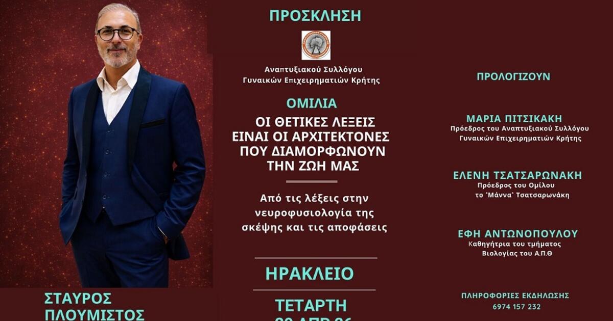 Ο Σταύρος Πλουμιστός θα παρουσιάσει πώς οι θετικές λέξεις μπορούν να λειτουργήσουν ως «αρχιτεκτονικά σχέδια» της ζωής μας, συμβάλλοντας στην προσωπική ανάπτυξη, ενδυνάμωση και ευημερία.