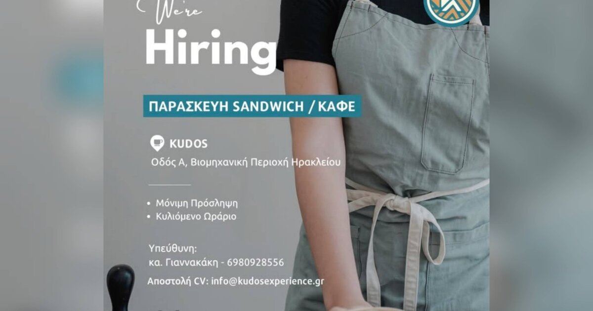 Στο Kudos, ο καφές δεν είναι απλώς ποτό, είναι εμπειρία. Αν είσαι λάτρης του καλού καφέ και θες να γίνεις μέλος της ομάδας του Kudos στη ΒΙ.ΠΕ. Ηρακλείου για να φτιάχνεις τα πιο νόστιμα σάντουιτς και υπέροχους καφέδες, να εξυπηρετείς τους πελάτες με χαμόγελο και κέφι ... δεν έχει παρά να απευθυνθείς στην υπεύθυνη κα. Γιαννακάκη στο τηλ. 6980928556 και να στείλεις το βιογραφικό σου στο info@kudosexperience.gr