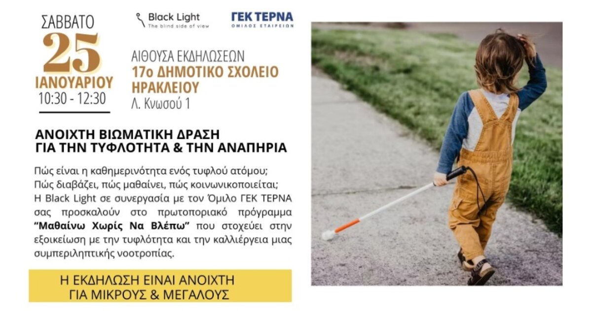 Το Σάββατο 25 Ιανουαρίου, στις 10:30 π.μ., στο 17ο Δημοτικό Σχολείο Ηρακλείου, η Black Light διοργανώνει μια ανοιχτή βιωματική εκδήλωση που προάγει τη συμπερίληψη και την κατανόηση της αναπηρίας.