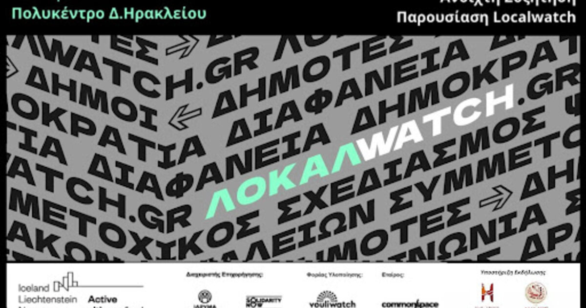 Στο πλαίσιο της υλοποίησης του έργου «Ψηφιακή Πλατφόρμα Συμμετοχικής Δημοκρατίας - λόκαλwatch», το οποίο χρηματοδοτείται από το πρόγραμμα “Active Citizens Fund στην Ελλάδα”, το Vouliwatch με την υποστήριξη του Δήμου Ηρακλείου και του Α.Ο.Τ.Α ΗΡΑΚΛΕΙΟ Α.Ε σας προσκαλούμε στην Ανοιχτή Συζήτηση - Παρουσίαση Πλατφόρμας, η οποία θα πραγματοποιηθεί την Πέμπτη, 29 Ιουνίου στις 12.30 - 14.00 στο Πολύκεντρο του Δήμου Ηρακλείου.