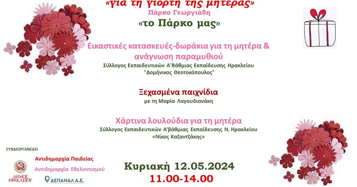 Μία ανοιξιάτικη δράση με αφορμή τη Γιορτή της Μητέρας διοργανώνουν οι Αντιδημαρχίες Παιδείας και Εθελοντισμού του Δήμου Ηρακλείου μαζί με τη ΔΕΠΑΝΑΛ ΑΕ, την Κυριακή 12 Μαΐου, στο Πάρκο Γεωργιάδη.