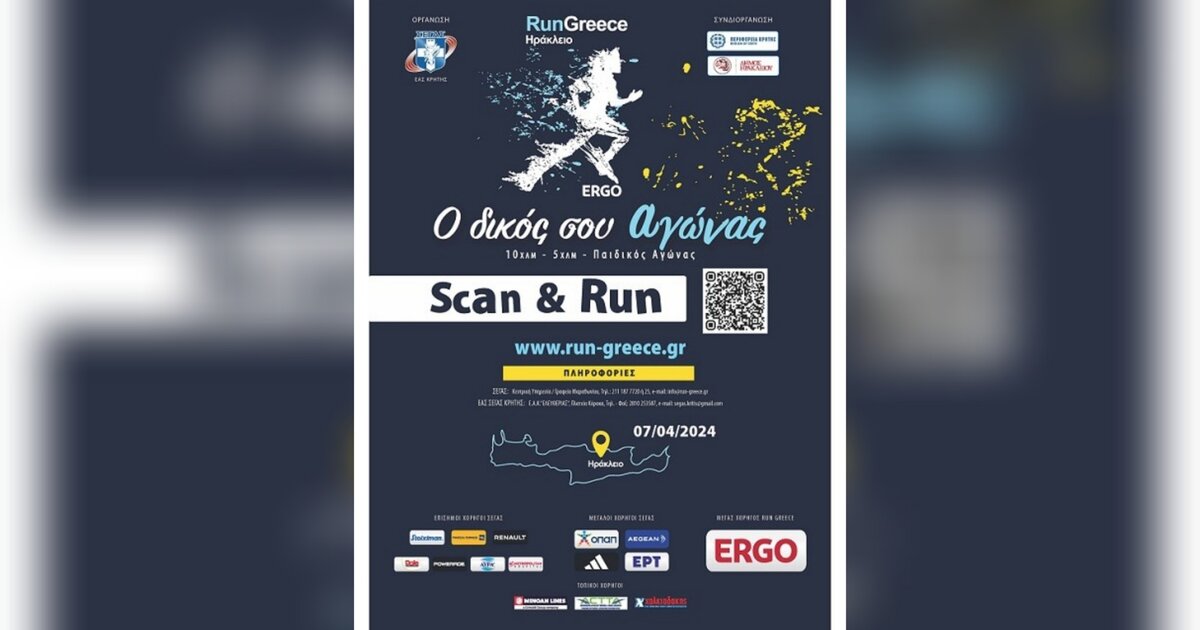 Τον αγώνα «RUN GREECE ΗΡΑΚΛΕΙΟ (5χλμ – 10χλμ και παιδικός αγώνας 1.100μ), διοργανώνουν την Κυριακή 7 Απριλίου, ο Σ.Ε.Γ.Α.Σ. και η Ε.Α.Σ. Σ.Ε.ΓΑ.Σ. Κρήτης, με συνδιοργανωτές την ΠΕΡΙΦΕΡΕΙΑ ΚΡΗΤΗΣ και τον ΔΗΜΟ ΗΡΑΚΛΕΙΟΥ, μεγάλο χορηγό την ERGO Ασφαλιστική και τοπικούς χορηγούς τις Μινωικές Γραμμές, το Σύνδεσμο Τουριστικών και Ταξιδιωτικών Γραφείων Κρήτης και τα Super Market Χαλκιαδάκης.