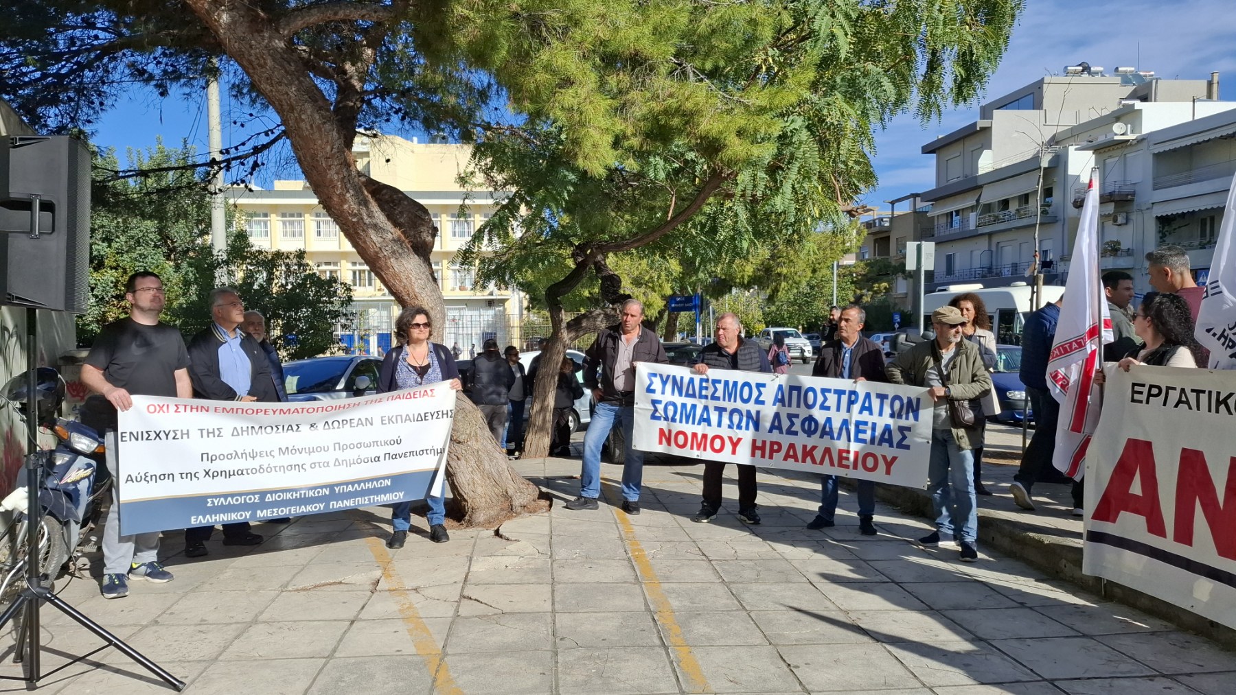 Απεργιακές συγκεντρώσεις στο Εργατικό Κέντρο Ηρακλείου, στην πλατεία Ελευθερίας και στο άγαλμα του Βενιζέλου στο Ηράκλειο, πραγματοποιήθηκαν το πρωί, στο πλαίσιο της σημερινής 24ωρης πανελλαδικής απεργίας, κάλεσμα στην οποία απήυθυναν τις προηγούμενες ημέρες φορείς και σωματεία. Αντίστοιχες συγκεντρώσεις πραγματοποιήθηκαν και σε άλλες πόλεις της Κρήτης.