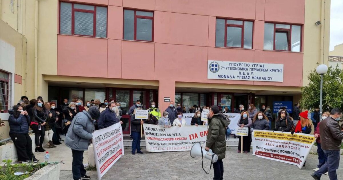 "Στην απεργιακή συγκέντρωση χαιρέτισαν οι πρόεδροι των σωματείων και μέλος της διοίκησης του σωματείου εργαζομένων στη ΠΦΥ Κρήτης. Την κεντρική ομιλία έκανε ο Δ. Βρύσαλης, πρόεδρος του σωματείου εργαζομένων ΠΑΓΝΗ, όπου κατήγγειλε την απουσία σύσσωμης της διοίκησης της 7ης ΥΠΕ με πρόσχημα, τη μη δημοσίευση σε ΦΕΚ της ανανέωσης τους και κατήγγειλε το σχέδιο για το «νέο ΕΣΥ» των απολύσεων, των νοσοκομείων-επιχειρήσεων, των ιδιωτικοποιήσεων και της επέκτασης των πληρωμών από τους ασθενείς και της κατάργησης της μόνιμης σταθερής εργασίας, για τους εργαζόμενους.