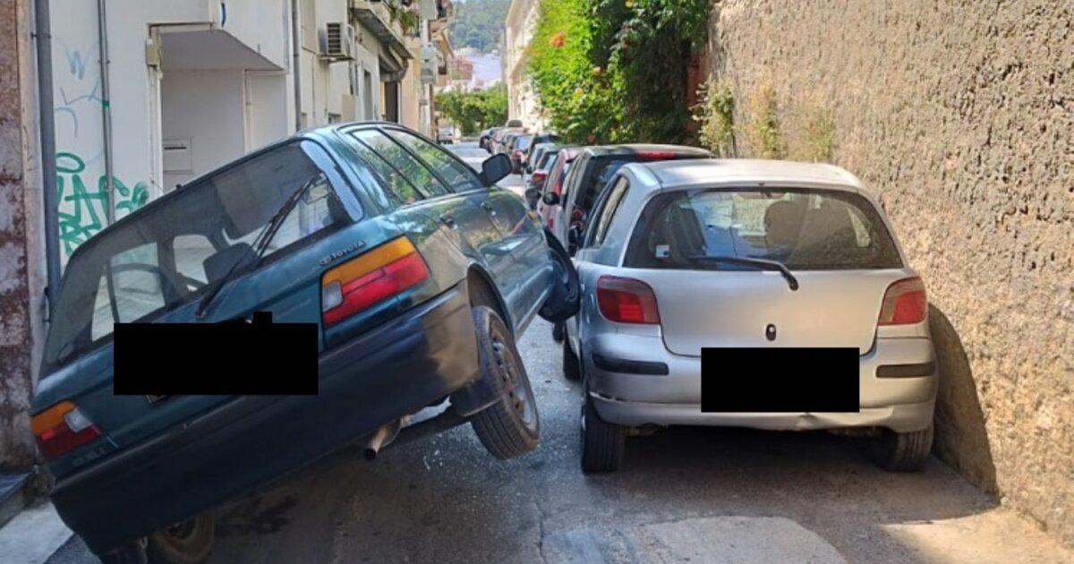 Σύμφωνα με το rethemnosnews.gr, οδηγός προσπάθησε να περάσει από την στενή οδό Μαρκέλλου και κατάληξε να "καβαλήσει" με το αυτοκίνητο του πάνω σε άλλο σταθμευμένο όχημα επί της οδού.