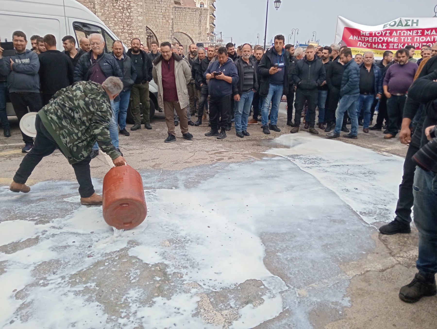 Αποχωρώντας από τα γραφεία της Αποκεντρωμένης Διοίκησης οργισμένοι κτηνοτρόφοι που είδαν τα προϊόντα τους να υποβαθμίζονται και τις τιμές να κατακρημνίζονται, σε ένδειξη διαμαρτυρίας έριξαν ποσότητες γάλακτος στην πλατεία.