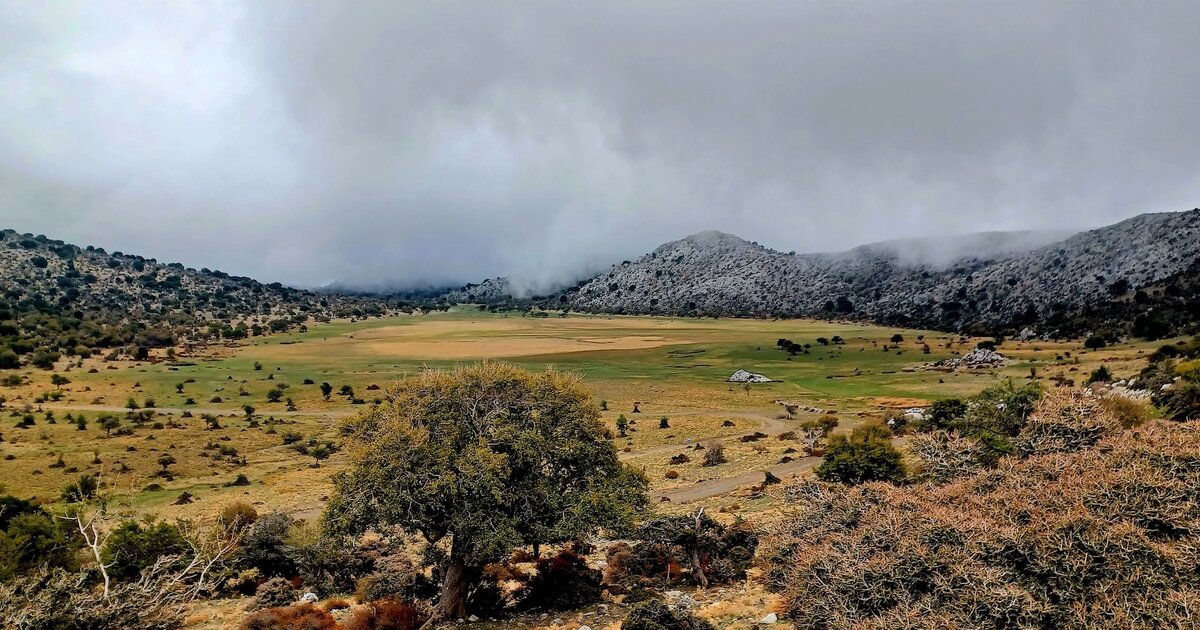 Η διαδρομή αρχικά είναι κάθετα ανηφορική μέσα από πυκνό πευκόδασος, που μοσκομυρίζει. Το παλιό μονοπάτι είναι ευδιάκριτο, αν και καλυμμένο με πευκοβελόνες, που φτιάχνουν έναν βελούδινο χαλί. Στα ξέφωτα η θέα στη θάλασσα ξεκουράζει το μάτι! Ο καιρός είναι ιδανικός χωρίς πολλή ζέστη, με ήλιο στην αρχή και συννεφιά στη συνέχεια κι όσο ανεβαίνουμε με υγρή ομίχλη! Και κάπως έτσι με σύντομες στάσεις ανασύνταξης διασχίζουμε τις τρεις ανηφορικές ώρες με παρεάκια και συζητήσεις (πολλή αλλά όχι εξοντωτική η ανηφόρα), περνώντας από όλων των λογιών τις καιρικές συνθήκες και από διαφορετικά δασικά περιβάλλοντα: πεύκα στην αρχή, πρίνα αργότερα και κρητικοί ασφένδαμοι λίγο πριν το οροπέδιο.