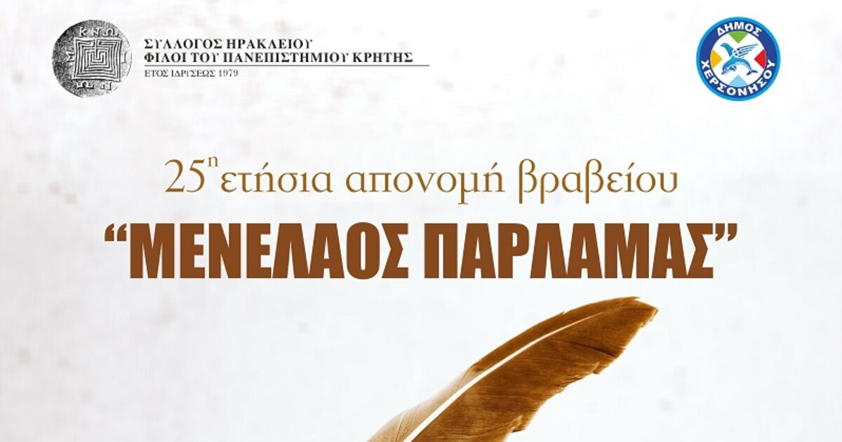 O Σύλλογος "ΦΙΛΟΙ ΤΟΥ ΠΑΝΕΠΙΣΤΗΜΙΟΥ ΚΡΗΤΗΣ" σε συνεργασία με την Φιλοσοφική σχολή του Πανεπιστημίου Κρήτης και τον Δήμο Χερσονήσου, διοργανώνουν την εκδήλωση απονομή του Βραβείου Παρλαμά, στις 6 Σεπτεμβρίου 2023.