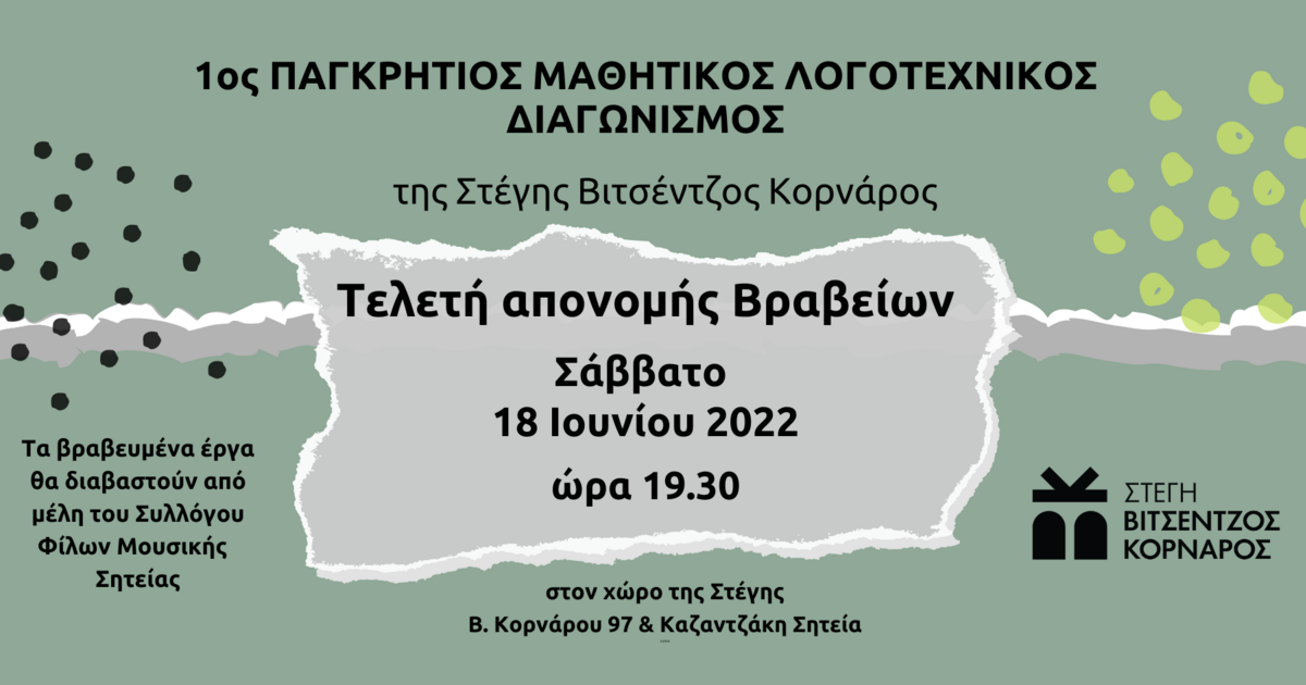 Η Στέγη Βιτσέντζος Κορνάρος, σας προσκαλεί στην Τελετή Απονομής Βραβείων 1ου Παγκρήτιου Μαθητικού Λογοτεχνικού Διαγωνισμού "Βιτσέντζος Κορνάρος", πραγματοποιεί η Στέγη Βιτσέντζος Κορνάρος το Σάββατο 18 Ιουνίου 2022, ώρα 19:30 στο χώρο της Στέγης (Βιτσέντζου Κορνάρου 97, Σητεία).