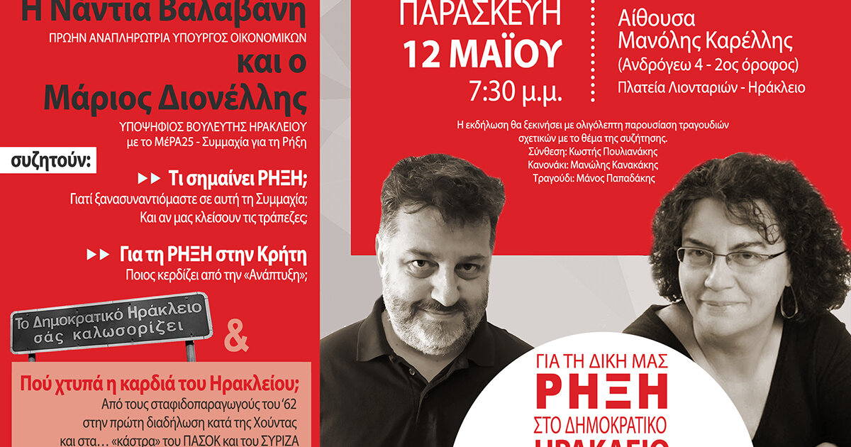 Δημόσια συζήτηση με τίτλο «ΓΙΑ ΤΗ ΔΙΚΗ ΜΑΣ ΡΗΞΗ ΣΤΟ ΔΗΜΟΚΡΑΤΙΚΟ ΗΡΑΚΛΕΙΟ» με τη πρώην Αναπληρώτρια Υπουργό Οικονομικών Νάντια Βαλαβάνη και τον Υποψήφιο Βουλευτή Ηρακλείου με το ΜέΡΑ25 – Συμμαχία για τη Ρήξη, Μάριο Διονέλλη θα πραγματοποιηθεί απόψε στο Ηράκλειο.