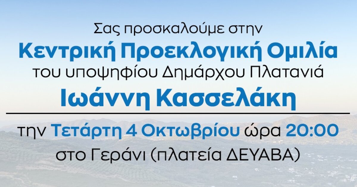 Την κεντρική προεκλογική ομιλία του πραγματοποιεί απόψε ο υποψήφιος Δήμαρχος Πλατανιά Γιάννης Κασσελάκης. Ο επικεφαλής του Συνδυασμού Δημοτική Κίνηση Πλατανιά - Πρόοδος Ανάπτυξη θα μιλήσει απόψε στις 20:00 στο Γεράνι (πλατεία ΔΕΥΑΒΑ).