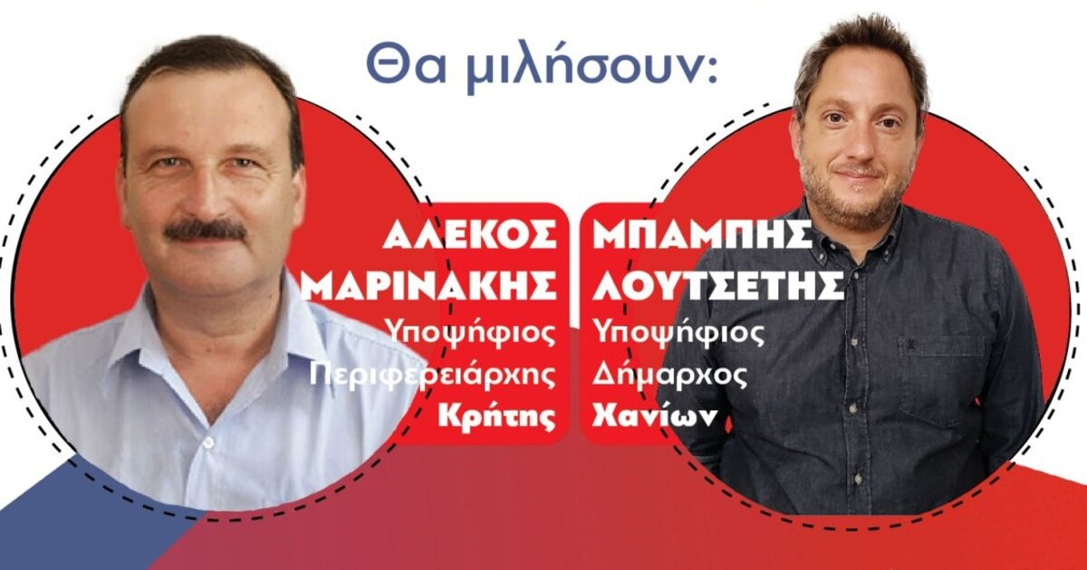Στην συγκέντρωση θα μιλήσουν ο Αλέκος Μαρινάκης, υποψήφιος Περιφερειάρχης Κρήτης και ο Μπάμπης Λουτσέτης, υποψήφιος δήμαρχος Χανίων.