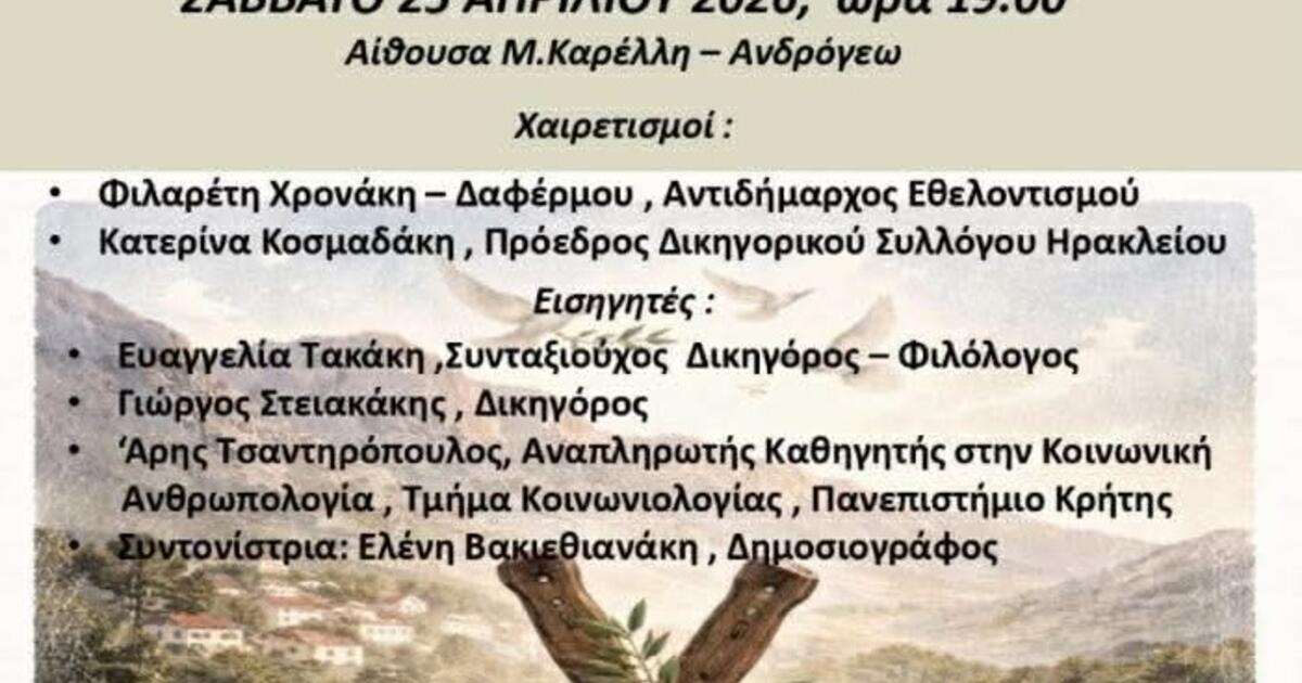 Την εκδήλωση θα προλογίσουν η Αντιδήμαρχος Εθελοντισμού Φιλαρέτη Δαφέρμου-Χρονάκη και η Πρόεδρος του Δικηγορικού Συλλόγου Ηρακλείου Κατερίνα Κοσμαδάκη.