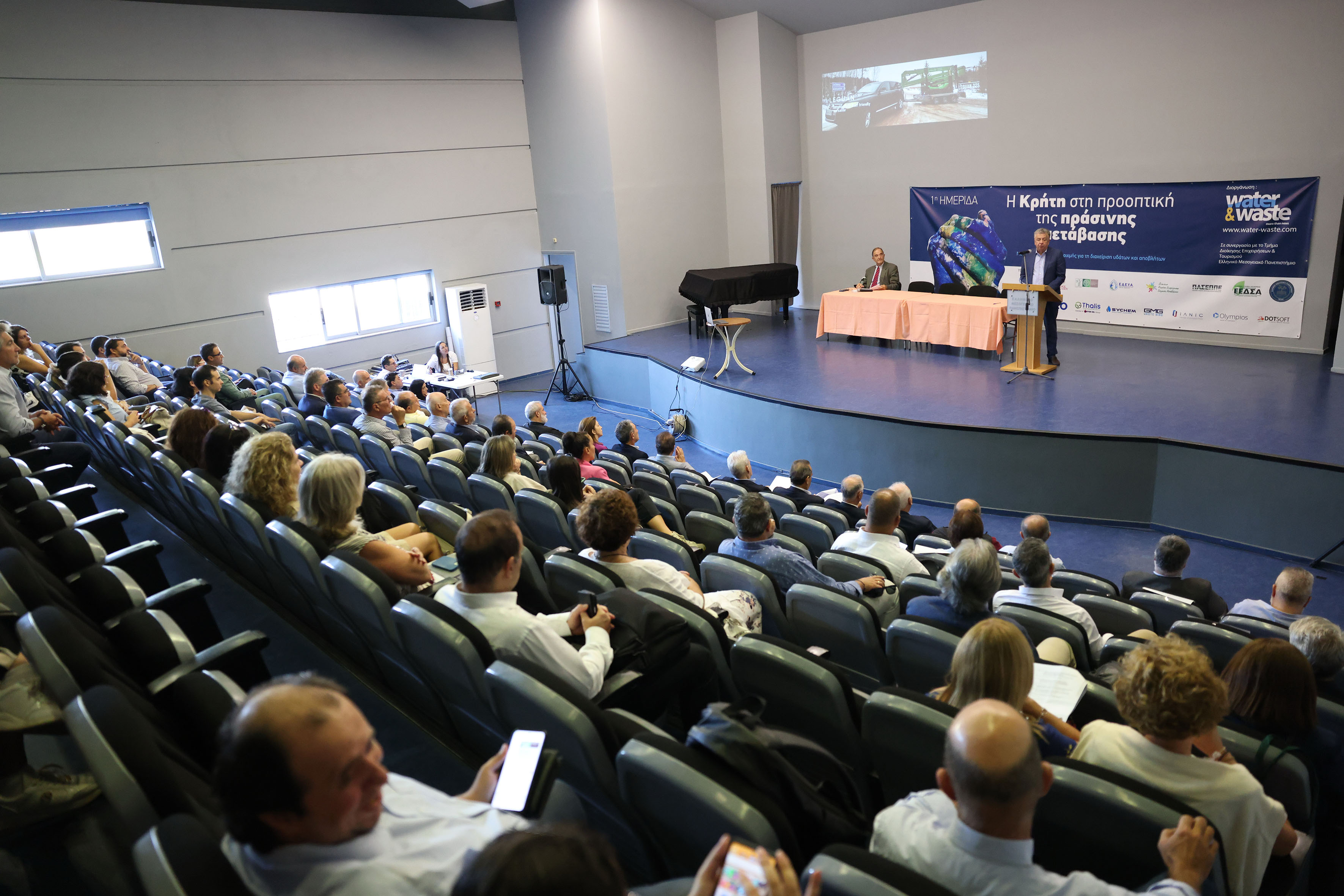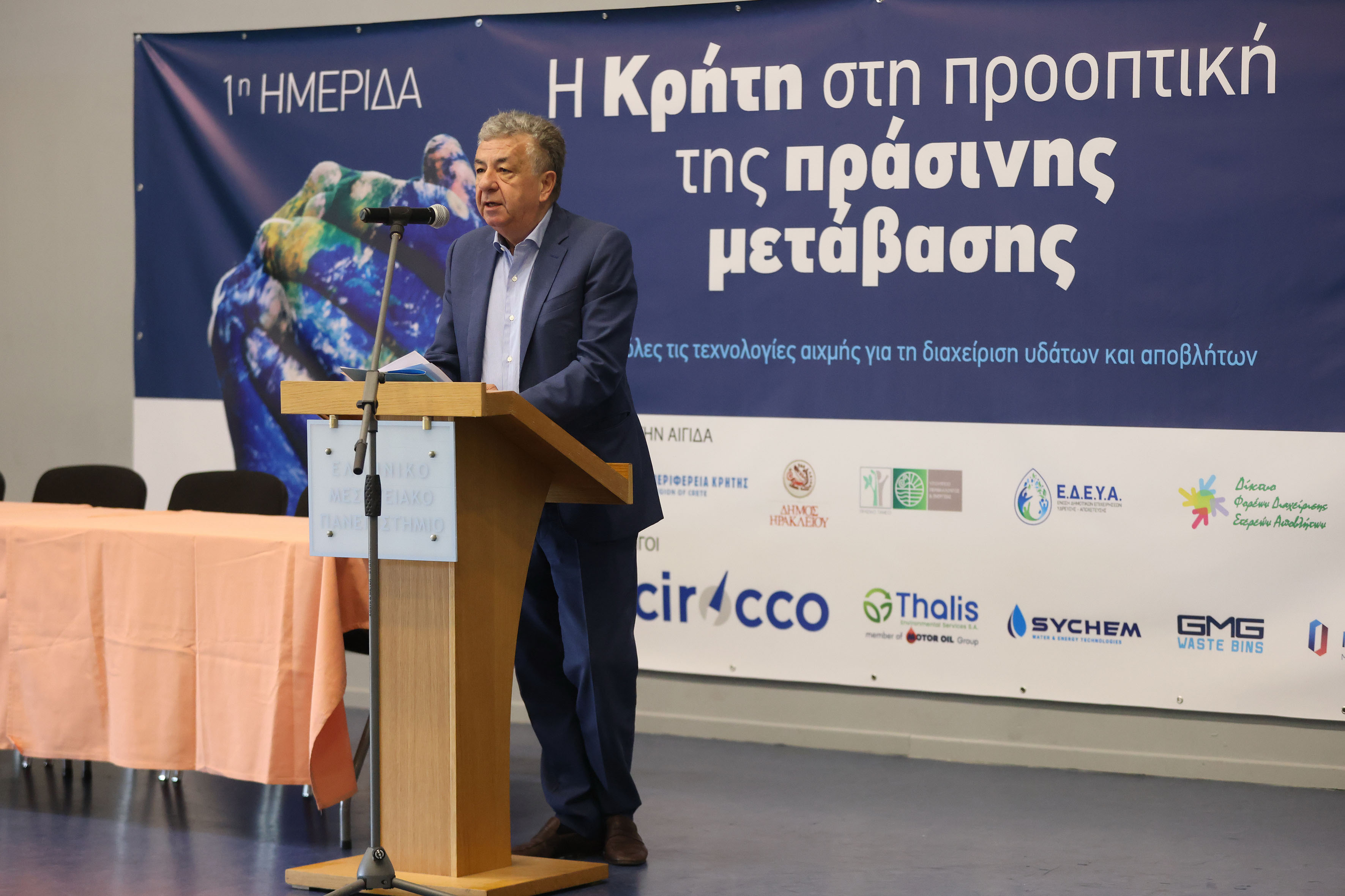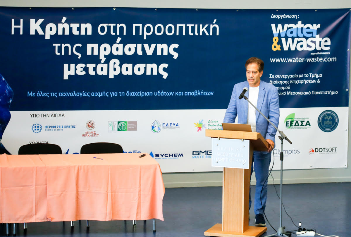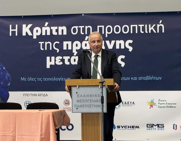 Με επιτυχία πραγματοποιήθηκε η ημερίδα με θέμα «Η Κρήτη στην προοπτική της Πράσινης Μετάβασης», την οποία διοργάνωσαν το τμήμα Διοίκησης Επιχειρήσεων και Τουρισμού του Ελληνικού Μεσογειακού Πανεπιστημίου (ΕΛΜΕΠΑ), η εκδοτική εταιρεία Water & Waste με την αιγίδα της Περιφέρειας Κρήτης, του Πράσινου Ταμείου, ΕΔΕΥΑ, ΦΟΔΣΑ και άλλων φορέων.