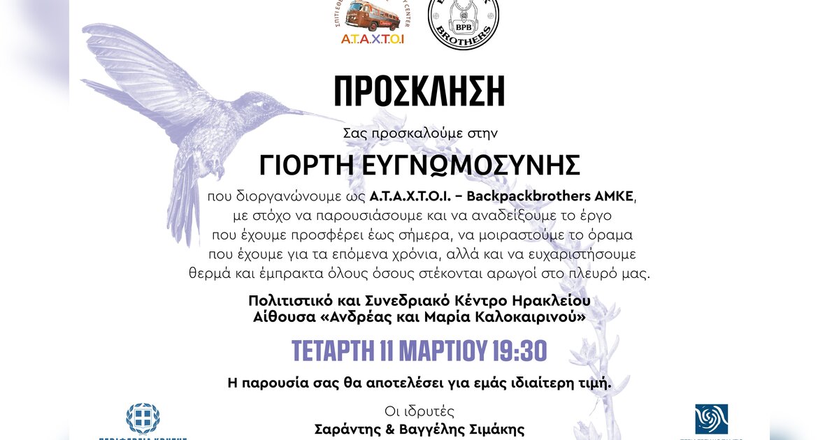 Οι Α.Τ.Α.Χ.Τ.Ο.Ι. – Backpack Brothers ΑΜΚΕ, με ιδιαίτερη χαρά σας προσκαλούνε στη «Γιορτή Ευγνωμοσύνης», η οποία θα πραγματοποιηθεί την Τετάρτη 11 Μαρτίου 2026 στο Πολιτιστικό Κέντρο στην Αίθουσα «Ανδρέας και Μαρία Καλοκαιρινού» στις 19:30.