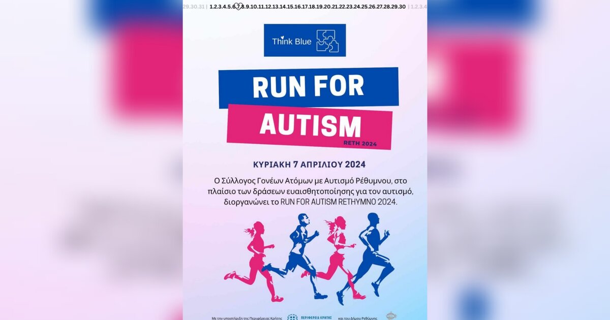 Ο Σύλλογος Γονέων Κηδεμόνων και Φίλων Ατόμων με Αυτισμό Ρεθύμνου οργανώνει στα πλαίσια της Παγκόσμιας Ημέρας Ευαισθητοποίησης για τον Αυτισμό, το πρωί της Κυριακής 07 Απριλίου 2024, στην Πλατεία Αγνώστου Στρατιώτη, 4 αγώνες δρόμου για αθλητές, μη αθλητές και παιδιά.