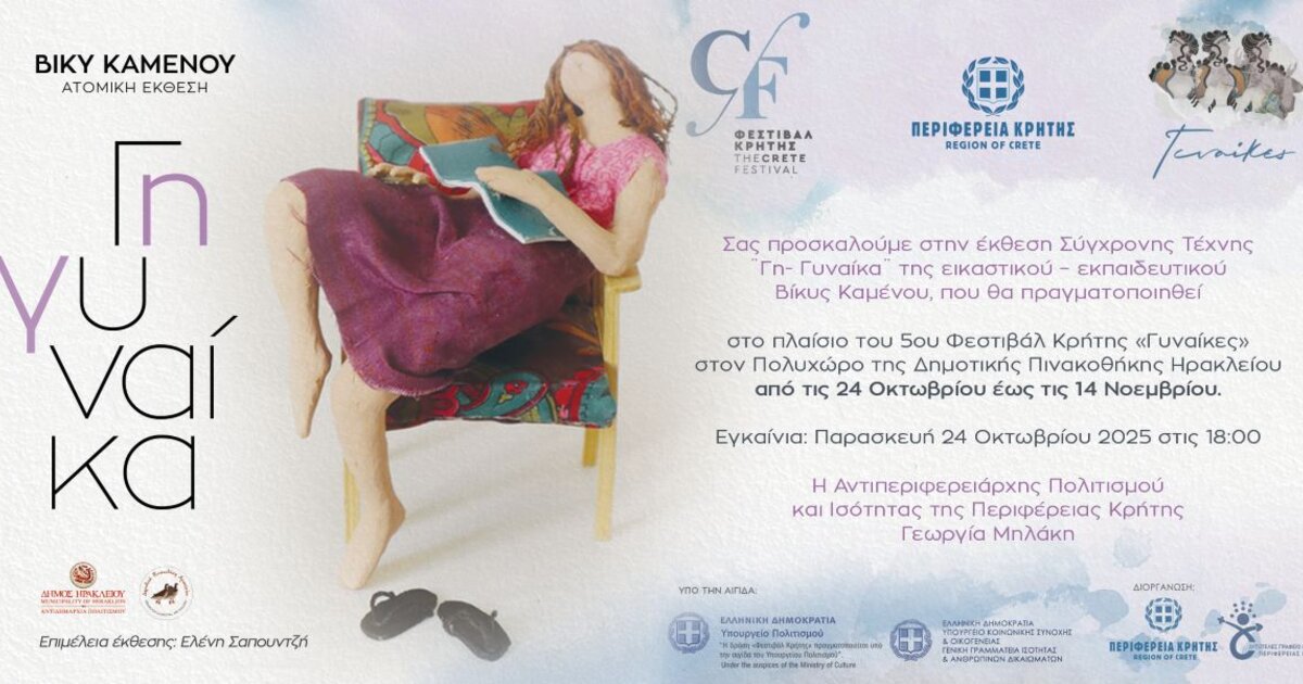 «Γη-Γυναίκα», είναι ο τίτλος της ατομικής έκθεσης της Βίκυς Καμένου, που θα παρουσιαστεί στη Δημοτική Πινακοθήκη Ηρακλείου (οδό Χρυσοστόμου 8) από τις 24/10/2025 έως τις 14/11/2025 στο πλαίσιο της παράλληλης δράσης του 5ουΦεστιβάλ Κρήτης «Γυναίκες», που υλοποιείται για 2η συνεχόμενη χρονιά, με την υποστήριξη του Αυτοτελούς Γραφείου Ισότητας της Περιφέρειας Κρήτης. Την επιμέλεια της έκθεσης υπογράφει η ιστορικός τέχνης Ελένη Σαπουντζή. Τα επίσημα εγκαίνια θα πραγματοποιηθούν την Παρασκευή 24 Οκτωβρίου 2025 και ώρα 18.00.