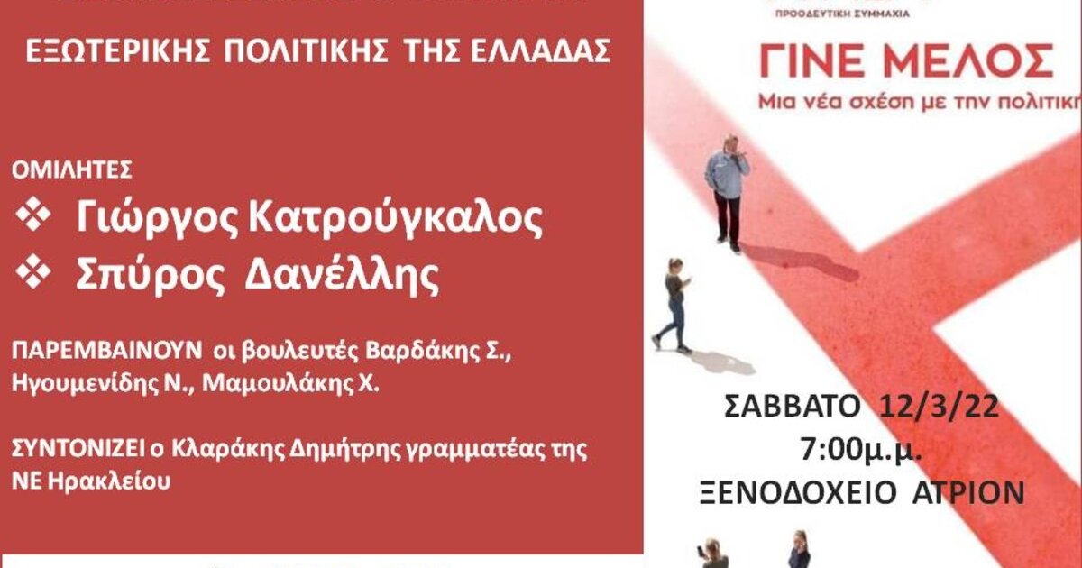 Ανοιχτή πολιτική εκδήλωση με τίτλο «Ο πόλεμος στην Ουκρανία, διεθνείς εξελίξεις και ζητήματα εξωτερικής πολιτικής της Ελλάδας» διοργανώνει η Νομαρχιακή Επιτροπή Ηρακλείου του ΣΥΡΙΖΑ-ΠΣ, το Σάββατο, 12 Μαρτίου, στις 19:00, στο ξενοδοχείο Atrion.
